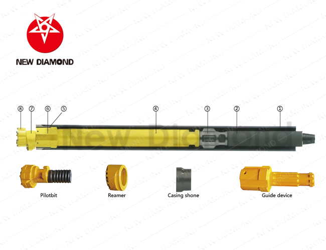 When drilling, the reamer bit will rotate out to enlarge the hole which enough for the casing tube slide down behind the reamer. When reached required depth,the drill pipe will drill to the reverse direction and the reamer bit will retract, it is allowing the whole drilling system to pass through the casing.